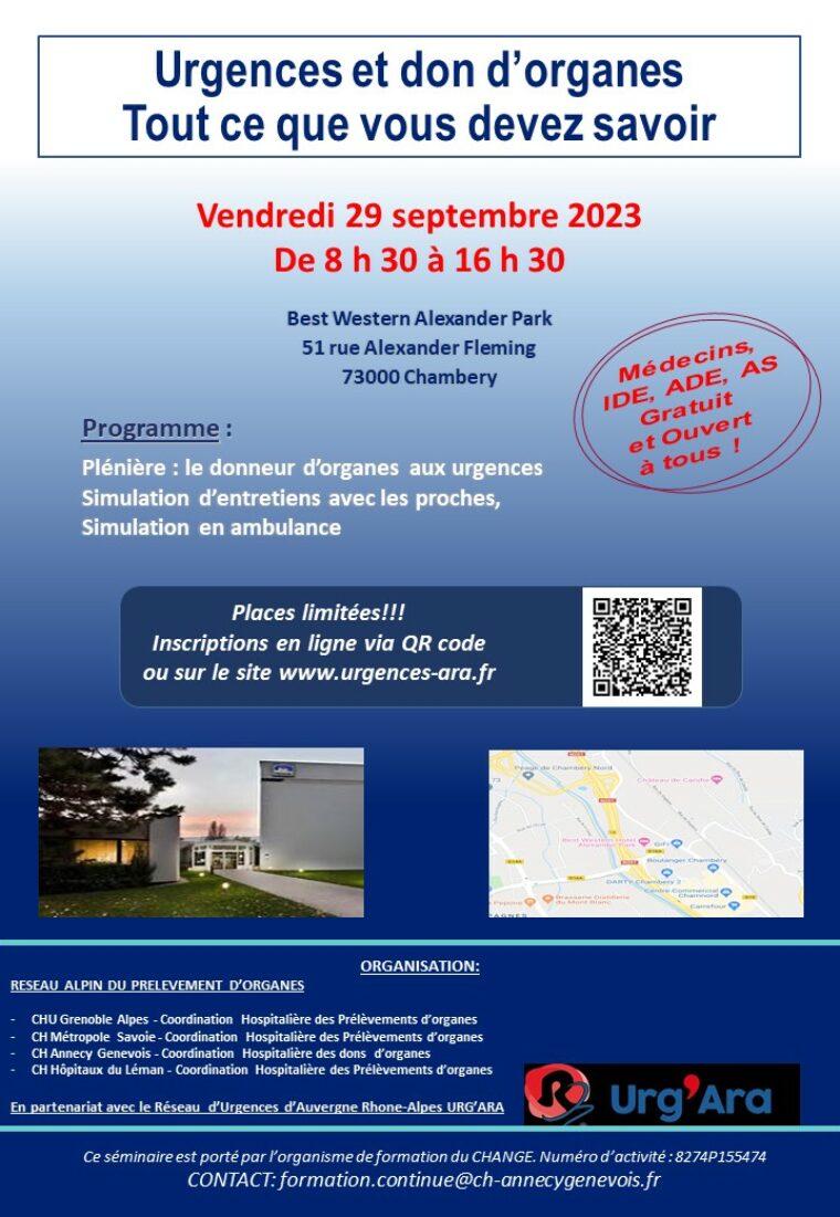 Le Réseau Alpin du Don d’organes organise une journée de formation à visée des soignants d’urgence. Le programme s’organise en une session plénière sur le « Donneur d’organes aux urgences » et des ateliers de simulation « Entretien avec les proches » et « Gestion d’un donneur en UMH »